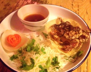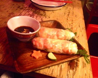 This family-run Vietnamese is located in the heart of the hip Victoria Park Village, which is sort of a hipster version of Chiswick. There are a lot of Vietnamese restaurants around in Hackney, but this one has a cool factor and has set itself in the middle of Bohemia. The decor is quite nice, bright red Frenchy Wallpaper and red metal chairs, street stall style. The back of the place has an option for open-air on nice days, which I thought was a very Southeast Asian touch- could totally see that in Thailand somewhere. I also liked their mix matched chop sticks and the white metal and enamel plates that were artfully chipping away. Also the wine list was very cheap, which we liked, but a really teeny selection, which we didn’t.