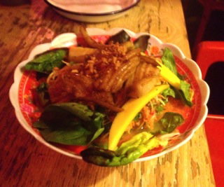 We also tried the green mango salad, a Southeast Asian mainstay, and I was really impressed with it. Its usually my test for a good Thai or Vietnamese, this Som Tam Salad, and they really pulled it off. It was very pungent, very sour, very sweet…all you want in your Som Tam. There were fried shallots and nice herbs to top (ok, more herbs would’ve better and more authentic, but this was ok…), and we had it with some perfectly cooked soft calamari.