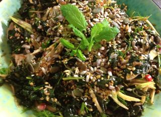 Prepare your cavolo nero, and then wash and chop into thick chunks. Place into a steamer with your garlic, chili, red and green onions, spices, and lemon. Season and then steam for ten minutes or until very soft (but not mutilated). Meanwhile, chop your herbs and place in a bowl with all of the seeds, shredded green mango, and scallion tops.