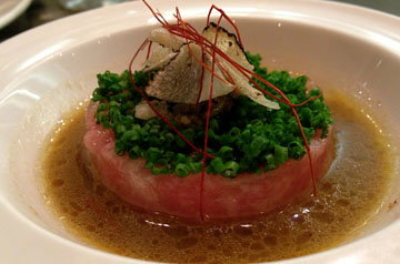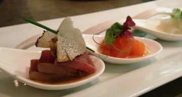 Then arrived four spoons of Scottish salmon sashimi served with a coriander leaf for each spoon and a light onion and yuzu sauce. This was quite boring actually and really needed some oil and saltiness. A little sprinkling of interesting rock salt or just plain soy sauce would have brought the flavors together a little better. Not bad, but completely forgettable.