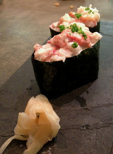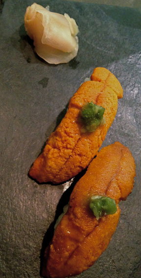 Finally to end, some sushi. we ordered Scottish native lobster tar tar gunkan style with a yuzu-jalapeno sauce served with a nori wrapper on a little bed of rice. Absolutely delightful in every way, and for me symbolic of the whole place. Tiny, perfect, casual, gem-like. The final bite of the evening? Well one can never go wrong to end wth a little uni. So we ordered two lightly seared pieces of uni (sea urchin) sushi topped with kizami – wasabi. It was very fresh, as uni must be, and a mouth watering treat in London, as it is rarely seen on Japanese menus.