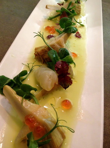 Next arrived the Turbot sashimi and artichoke salad with a yuzu-kosho and jalepeno dressing. Served lengthwise on a long plate, which was a really appealing way to present a “salad”. The baby artichoke was super soft and quartered neatly in between the turbot. There were bits of ikura (salmon roe) and peppery pea shoots strewn across the plate which added color and dimension. The dressing was quite delicate and almost floral, with a very gentle olive oil to blend all the flavors together. Quite beautiful.