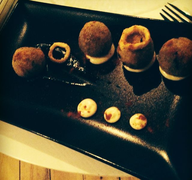 We started with the Squid Croquettes. They arrived in these tiny little perfectly round crispy balls that were soft and bursting with black squid ink when you put it into your mouth. It was not only delicious, but also quite sexy. There were cute little squid rings placed sweetly on top of each ball and there was lovely delicate mayonnaise sauce to compliment the heaviness of the ink. It felt and tasted restrained and sophisticated. Also, very inventive and appealing to the eye. My only complaint is that it was quite under seasoned and quite small…and sadly this trend continued…