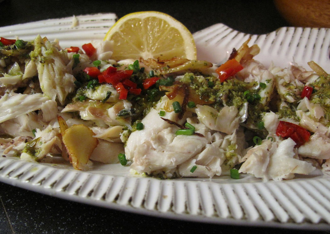 When you are ready to serve, put a couple of tablespoons of pesto across fish and sprinkle the chilli and garlic/shallots on top with some sliced lemon wedges. A dribble of olive oil over the dish to complete.
