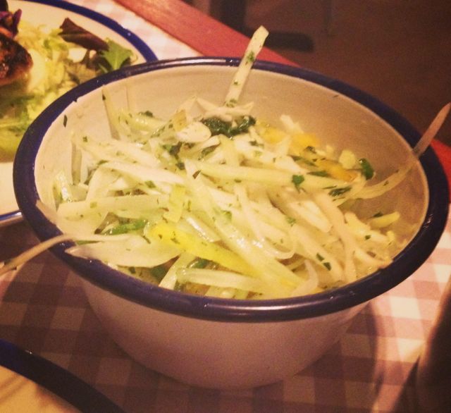 We shared our main, which was the Grey Mullet. You don’t see this on the menus much and it is in season, so I thought I would have a go. Again, zero seasoning. I understand things in a “seaside” café should be simple, but salt and pepper can and should be used. Once we added some salt, the fish perked up quite a bit. There was a lovely sprinkling of almonds, which gave it a nice texture and crunch. It was seated on a bed of potato mash, which just tasted like a baked potato- mashed. Then there was some sort of tasteless spinach slash sauce to the side, which was creamy but again very bland. The dish just needed some love. We had a side to go with the main, and my date chose the slaw. It was slightly tangy a touch of vinegar and oil, but no mayo. It was white cabbage with bits of sea greens scattered about. Seasoning and Spirit a far distant cousin. Yawn.