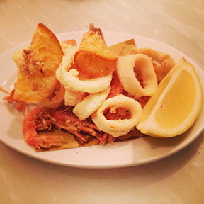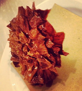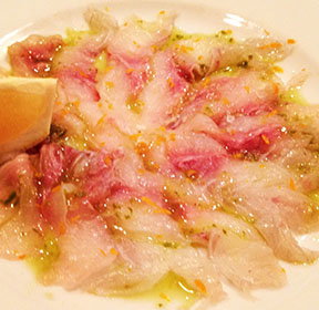 There is an outstanding tartar they do out of very lean venison that is made incredibly simple, with capers, parmesan, and bits of polenta for texture. I had this with the truffle the first time and almost fell off the bar stool it was so sublime. They do a little fried section and we had the fried squid with those baby Sicilian red prawns, that are quite rare. They even bother to give you extra fried shrimp heads, which for some of us is real treat. The batter is delicate and light and the squid and prawns soft and fresh. There were also tiny slivers of fried orange that had a lovely citrus contrast to the seafood and perked it up perfectly. Almost everything is served with a wedge of lemon only, which I really liked the cleanness and simplicity of.