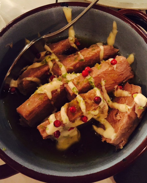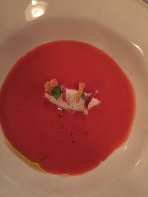 First arrived a cherry gazpacho. Cherries were in season during the tasting of this restaurant and could be seen everywhere- so I loved the use in this cold and summery soup. The cherry gave it a slight tart and sweet quality that worked really well, and added at the center was a little pleasing touch of soft goat cheese, which gave it creaminess and depth. The rich luxurient red color was enticing and sexy.