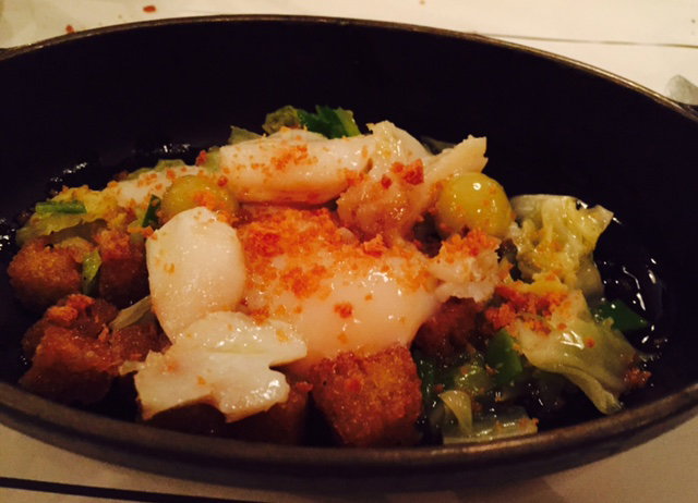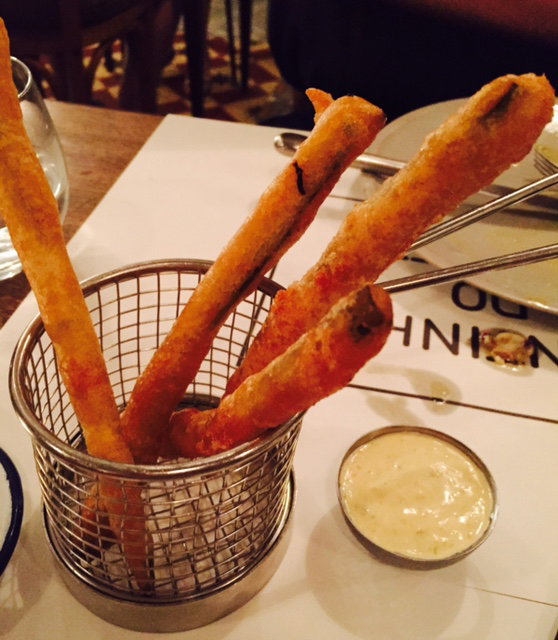 Then we had whole long green beans battered and fried and served in a cute baby fryer with a pickled mayo sauce. This is a traditional Portuguese dish taken to a gourmet level. A great interpretation, although I think a salsa or gazpacho sauce maybe would’ve been more interesting…
