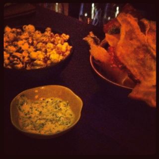 The cocktail list is also quite elegant with the use of a lot of champagne. I tried the luxury mojito which was fresh and lively with mint and sparkle. We also tasted the ginger fizz which was simply champagne and ginger infused syrup, but it’s simplicity and cleanliness was quite appealing. Served with our drinks was a bowl of “bacon-ed” popcorn. I liked the use of the bacon dust instead of salt, very witty. Also served were a variety of paper thin crackers, some made of seaweed, some of cod skin, and some with fried oats. There was a simple raita like dip to sink the crackers into which created a light sour elegance in your mouth. The mixture of textures from the snacks were really refreshing and inventive. although I can’t say they were incredible in flavour, but I really enjoyed the feminine playfulness in my mouth.