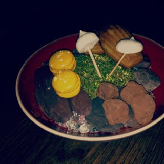 We didn’t order dessert, but at the end we were presented with a lovely “forest scene” of delights. Madeleines were made with seaweed and were delicate and perfectly cooked, being moist on the inside and crispy on the outside. I actually adored the hint of the sea, like a mermaid biscuit. Sweet yellow macaroons were a lovely second bite, and I started to love the cheese plate- like order of sweet bits. Next was an overly powerful dark and very bitter chocolate “stones”, in which I found actually unpleasant and heavy. But maybe that is what a “rock” should taste like? This was an odd choice but visually worked on our “forest scene “. Finally we tasted the toothpaste like “mushroom caps”, cutely affixed onto wooden spikes, and had a look of a giant enoki mushroom. Charming and very faerie, but literally had a Listerine quality which I found slightly unpleasant.